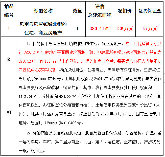 1、思南縣思唐鎮(zhèn)城北街的住宅、商業(yè)房地產(chǎn),建筑面積共:380.41㎡;起拍價(jià):136萬元;競(jìng)買保證金15萬元。
