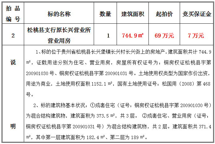 2、松桃縣支行原長(zhǎng)興營(yíng)業(yè)所營(yíng)業(yè)用房,建筑面積共:744.9㎡;起拍價(jià):69萬元;競(jìng)買保證金:7萬元。