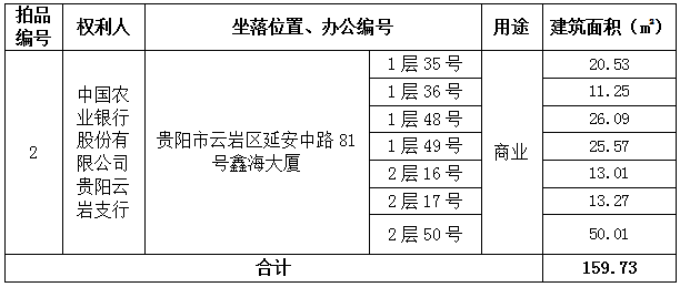 2、貴陽市云巖區(qū)延安中路81號鑫海大廈1層35、36、48、49號及2層16、17、50號商業(yè)房地產(chǎn)(總建筑面積:159.73㎡)。
