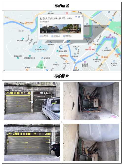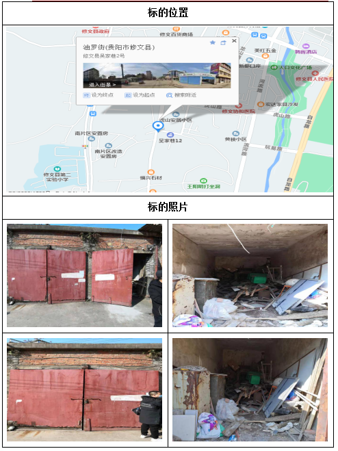 標(biāo)的位于修文縣人民南路工行洗腳塘宿舍,建筑面積為30㎡,共兩個(gè)獨(dú)立車庫(kù)。該標(biāo)的東至人民南路,南至小區(qū)道路,西至小區(qū)道路,北至小區(qū)道路;建筑結(jié)構(gòu)為磚混結(jié)構(gòu),層高約3米,無(wú)物業(yè)管理,戶型結(jié)構(gòu)為開(kāi)間。