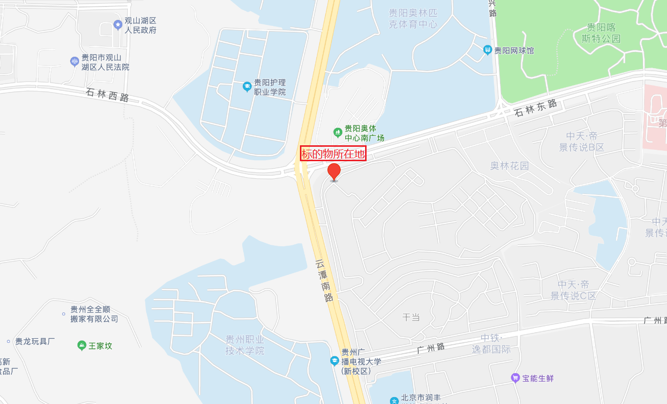 該標的周邊道路通達、停車便捷、基礎設施完備,達“五通一平”,室內(nèi)地面鋪地磚、墻面貼石材,頂棚為層板吊頂,采光、通風良好。所在區(qū)域有金陽醫(yī)院、觀山湖區(qū)人民政府、貴陽喀斯特公園、貴陽奧林匹克體育中心等,商業(yè)集聚度及繁華度較高。