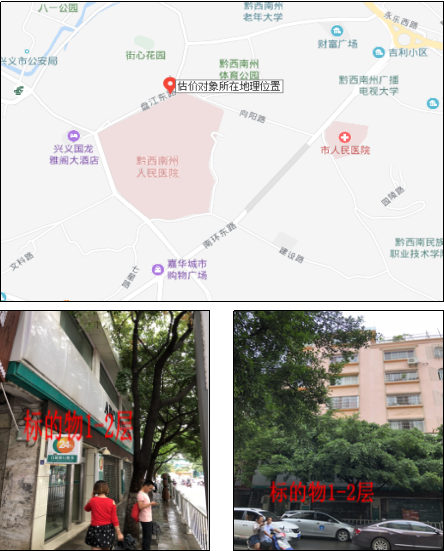 1、標(biāo)的物位于興義市盤江東路49號(hào)A幢第1號(hào)1-2層的綜合房地產(chǎn),標(biāo)的物建成于2005年,南面臨盤江東路,其余三面均臨多層建筑樓棟?;旌辖Y(jié)構(gòu),水電、生活燃?xì)狻⑾赖仍O(shè)施齊全。使用正常,維護(hù)狀況較好,普通裝修,地面鋪地磚,墻面及頂面刮瓷粉刷乳膠漆,鋁合金窗,防盜門、卷簾門、木門。