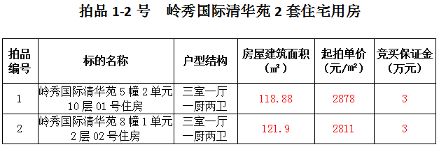 1、關嶺縣嶺秀國際2套住宅房產,建筑面積:118.88—121.9㎡,起拍價:2811—2878元/㎡;