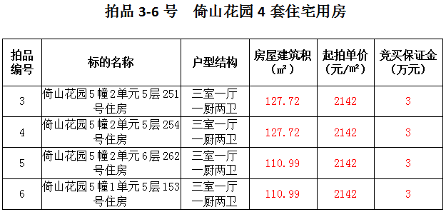 3、倚山花園4套住宅房產,建筑面積:110.99—127.72㎡,起拍價:2142元/㎡。