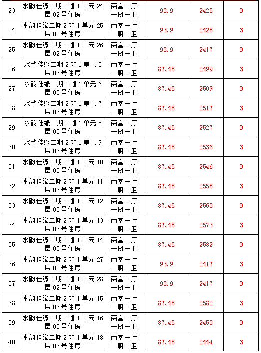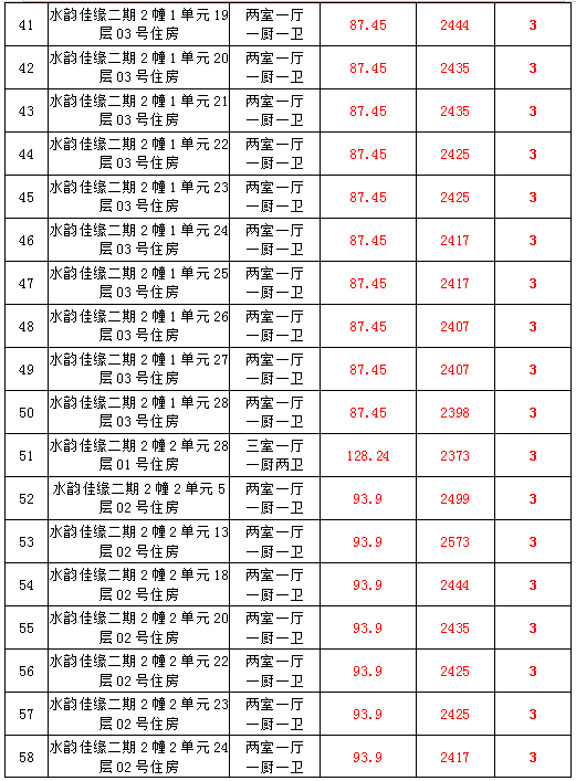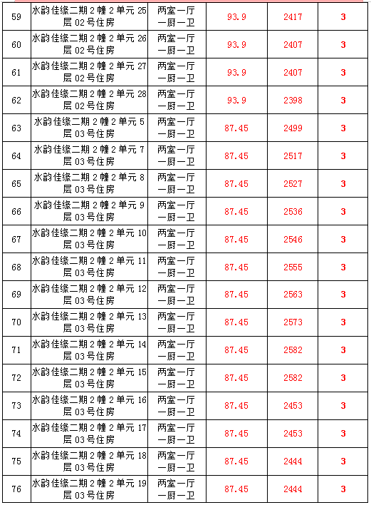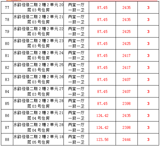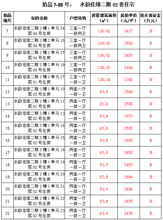 2、水韻佳緣82套住宅房產,建筑面積:87.45—128.24㎡,起拍價:2373—2582元/㎡;