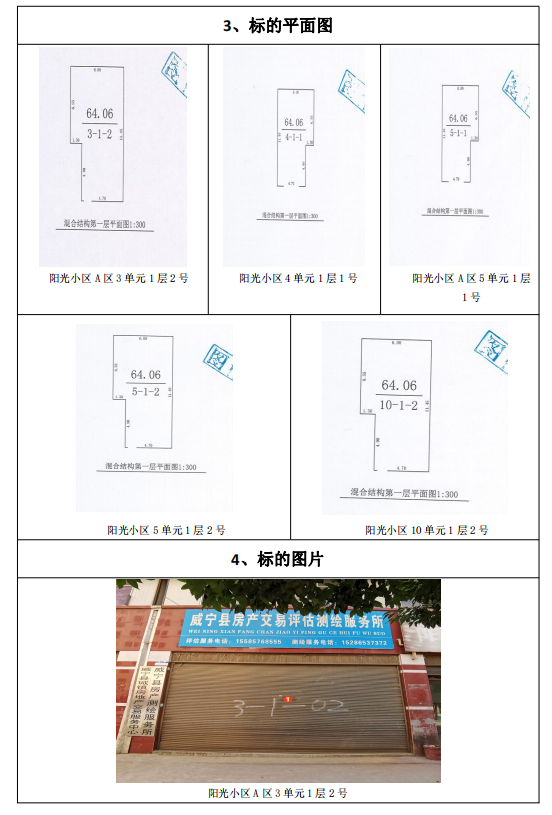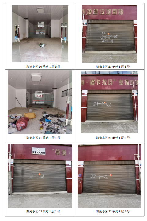 拍品編號16-21號標(biāo)的位于威寧縣海邊街道廣園路陽光小區(qū),房屋結(jié)構(gòu)均為:混合結(jié)構(gòu),權(quán)利性質(zhì):國有土地/出讓/其他,用途:商服用地/商業(yè)服務(wù),使用期限:2012年12月20號至2052年12月19日。