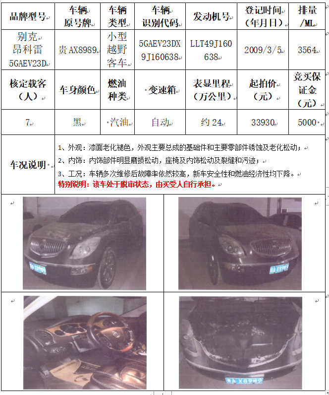 拍品編號9:別克昂科雷5GAEV23D小型越野客車一輛