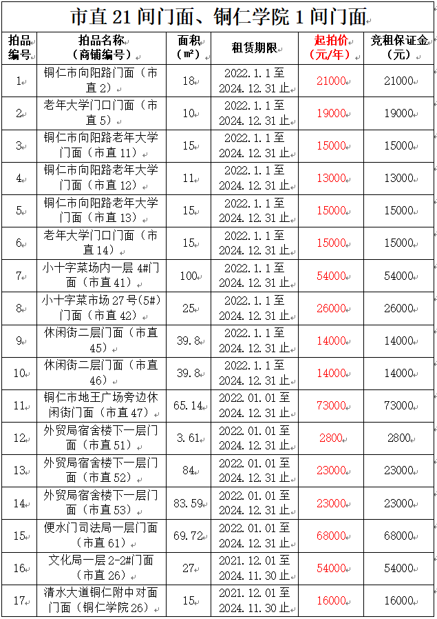 受委托,我公司定于2021年10月27日(星期三)下午14:30時,在銅仁市碧江區(qū)川硐教育園區(qū)誠信路銅仁市公共資源交易中心開標(biāo)六室(拍賣大廳)公開拍賣以下位于銅仁市的標(biāo)的租賃權(quán):