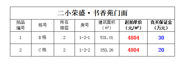 二小榮盛·書(shū)香苑門(mén)面2間,建筑面積:353.26—531.01㎡,起拍單價(jià):4804元/㎡;