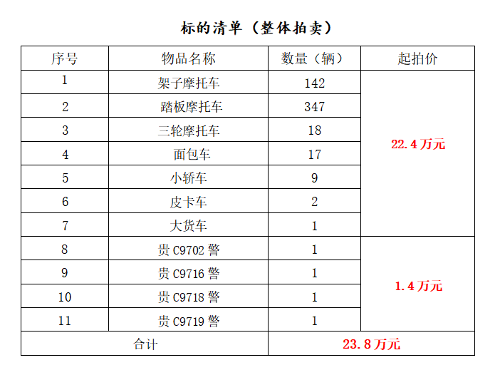 該批標(biāo)的為整體拍賣,包括架子摩托車、踏板摩托車、三輪摩托車、面包車、小轎車、皮卡車、大貨車一批(均作為報廢物資整體拍賣)。