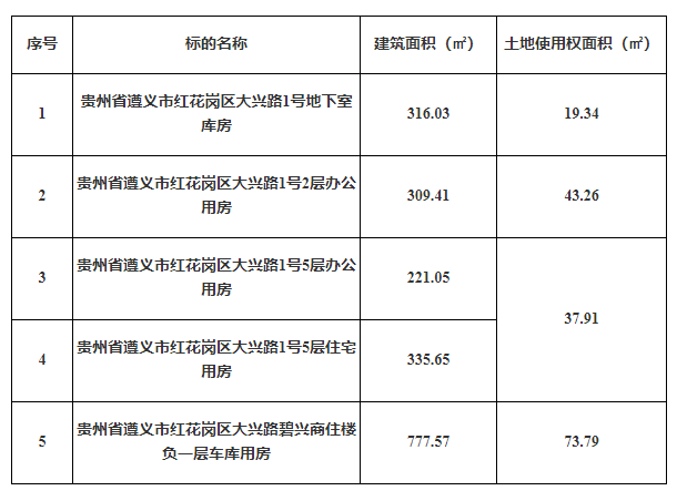 2、貴州省遵義市紅花崗區(qū)大興路1號(hào)地下室?guī)旆浚偨ㄖ娣e:316.03㎡);貴州省遵義市紅花崗區(qū)大興路1號(hào)2層辦公用房(總建筑面積:309.41㎡);貴州省遵義市紅花崗區(qū)大興路1號(hào)5層辦公用房(總建筑面積:221.05㎡);貴州省遵義市紅花崗區(qū)大興路1號(hào)5層住宅用房(總建筑面積:335.65㎡);貴州省遵義市紅花崗區(qū)大興路碧興商住樓負(fù)一層車(chē)庫(kù)用房(總建筑面積:777.57㎡)。