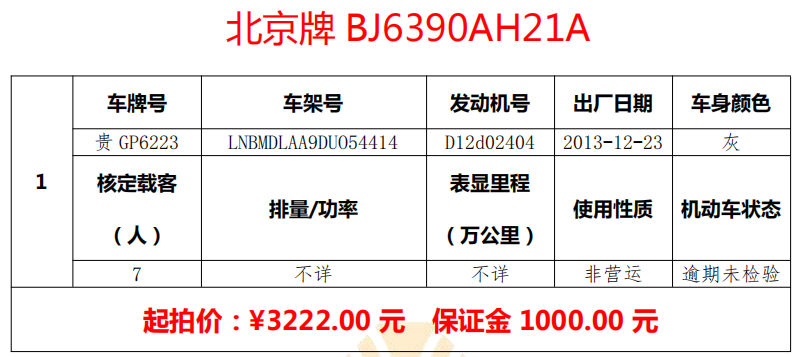 標(biāo)的三:貴GP6223北京牌小型面包車一輛。起拍價:3222.00元,保證金:1000.00元