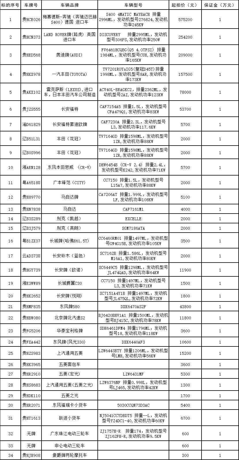 受委托,我公司將于2022年8月18日9:10在貴州省黔東南州公共資源交易中心及中拍平臺(tái)采用網(wǎng)絡(luò)與現(xiàn)場(chǎng)同步競(jìng)價(jià)方式公開(kāi)拍賣(mài)奔馳邁巴赫S400、路虎發(fā)現(xiàn)、奧迪Q5、皇冠、雷克薩斯等涉案車(chē)輛34輛(可憑裁定書(shū)自行辦理過(guò)戶(hù))。