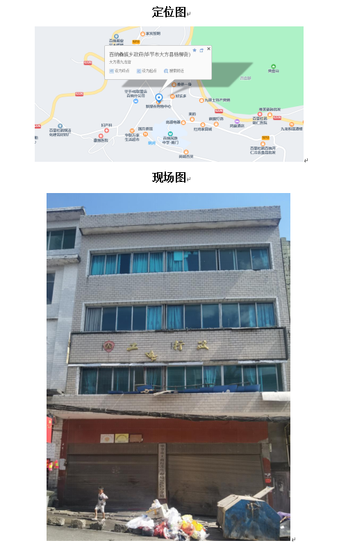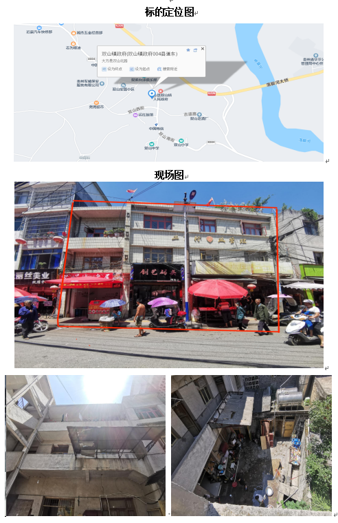 1、該標的位于大方縣百納鄉(xiāng)政府旁,建成于2003年,占地面積264.9㎡。共四層,分為前后兩棟。前棟:一層為門面2間,面積合計76.83㎡,現(xiàn)為閑置狀態(tài);二、三層面積分別為116.7㎡;四層面積為56.05㎡;前棟面積共計366.28㎡。后棟:半地下層在鄉(xiāng)政府院內(nèi),面積為38.9㎡;一、二層面積分別為137.43㎡;三層面積為95.73㎡;后棟面積共計409.48㎡。前后兩棟建筑面積共計為775.77㎡。